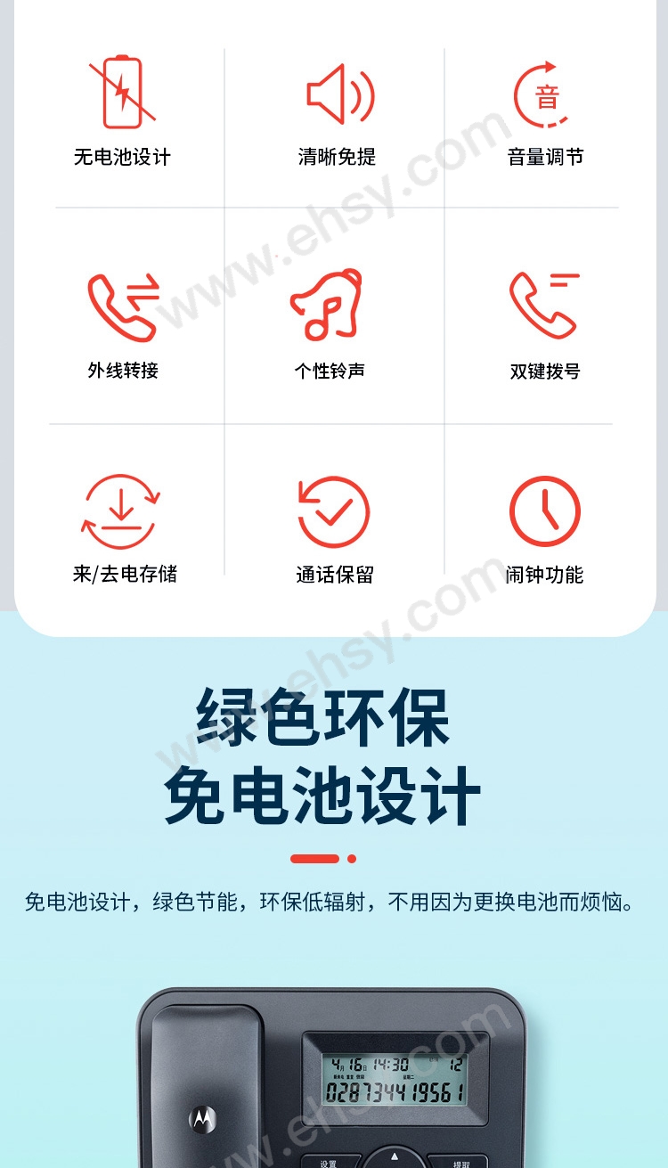 | 功能 | 来电显示、铃声选择、一键拨号、带通讯录、 |