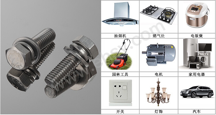 螺钉,一般运用于小的电子产品上。大一点的十字外六角组合螺钉运用于大一点的电气产品上,如变频器,大的一些变频器上面就有