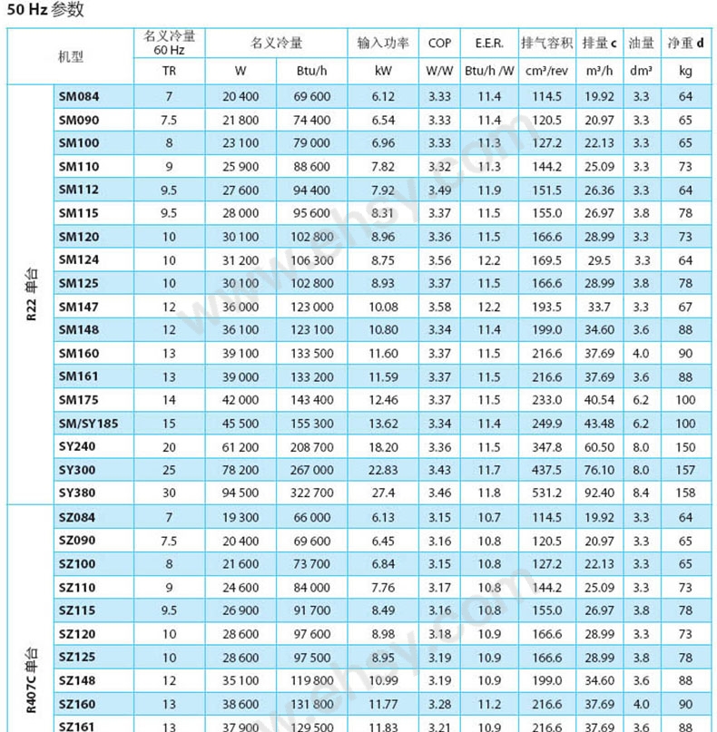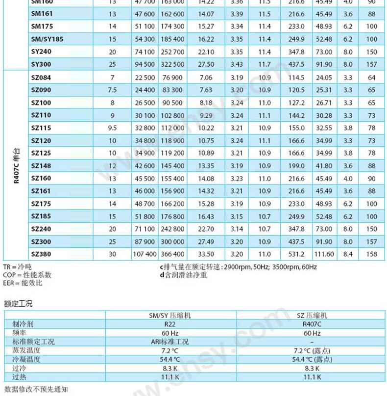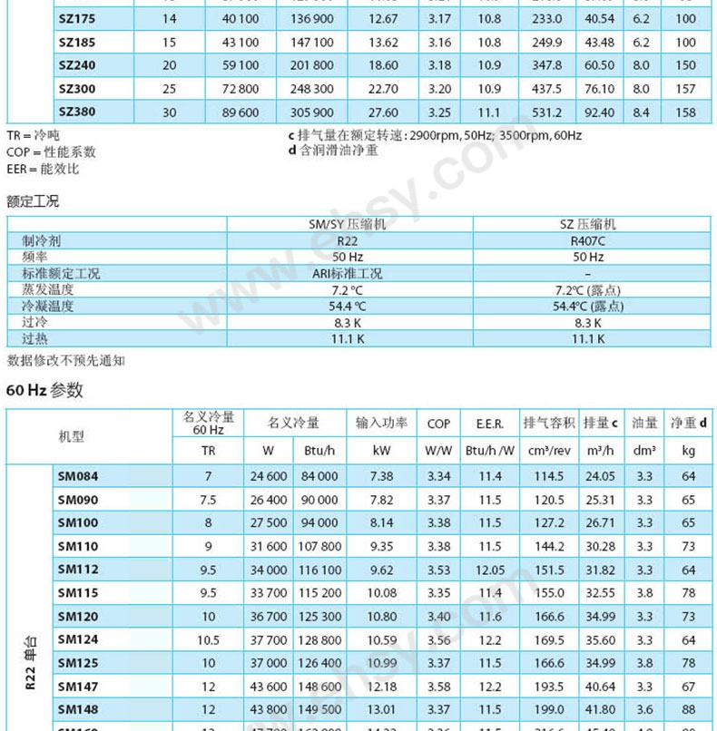 | 备注 | 50HZ/60HZ额定工况(SM/SY 压缩机)制冷剂: R22标准额定工况: ARI标准工况蒸发温度: 7.2℃冷凝温度: 54.4℃过冷: 8.3 K过热: 11.1K50HZ/60HZ额定工况(SZ 压缩机)制冷剂: R407C;蒸发温度: 7.2℃(露点);冷凝温度: 54.4℃(露点);过冷: 8.3 K;过热: 11.1K以下数据分别基于频率50HZ/60HZ的额定工况。排气量在额定转速:2900rpm, 50Hz; 3500rpm, 60Hz。净重含润滑油。 |