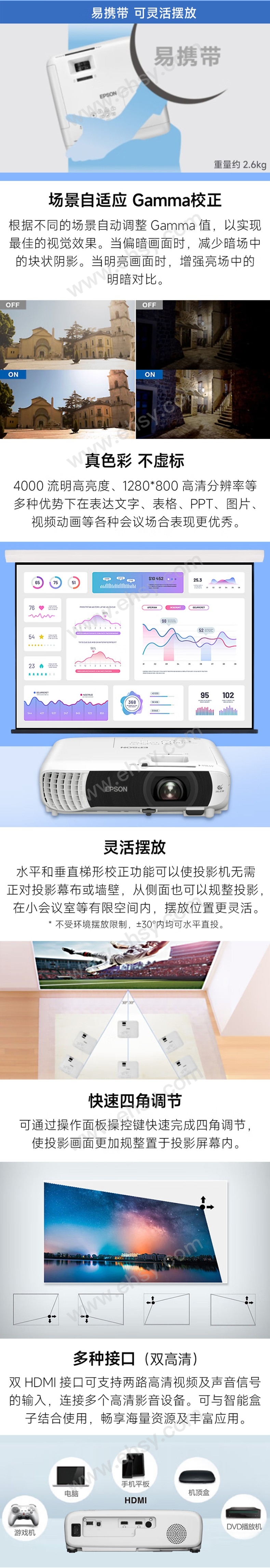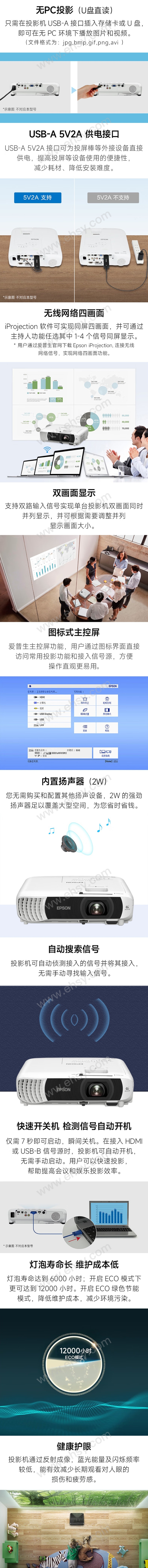 爱普生/Epson 投影仪,4000流明/WXGA高清分辨率 USB-A供电接口/裸机不含安装,CB-W55标配 售卖规格:1台