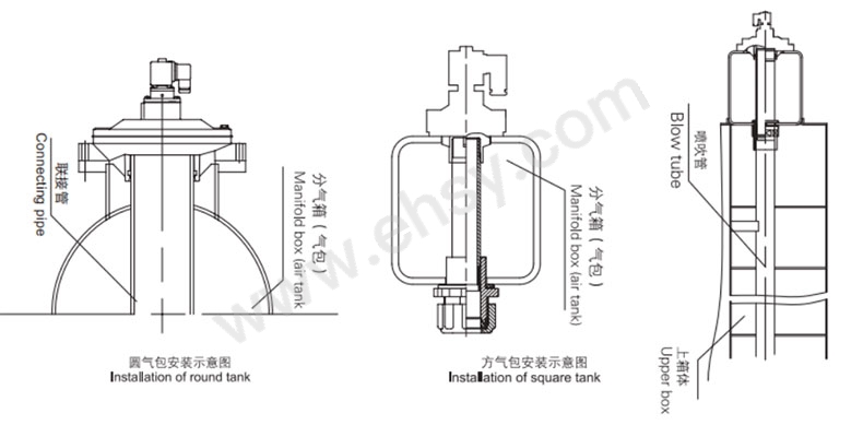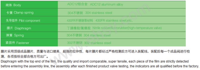DMF-Y型电磁脉冲阀直接安装在分气箱(气包)上,称为淹没式(也称嵌入式)低压阀,输出口通过连接管延伸至分气箱与除尘器喷吹管相连,具有流通性好,压力损失小,能在气源压力较低的场合提供理想的清灰脉冲气流,膜片为阀体主要损耗件,此为进口材质,更经久耐用。